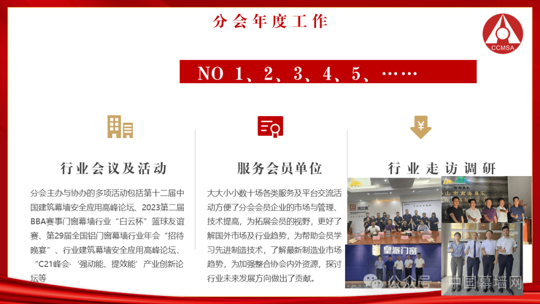 2024年分会积极开展铝门窗幕墙行业的全面工作,坚持高质量发展,紧抓时代特色,以行业企业需求为核心,以平台性、公允性、公开性为推动,开创中国铝门窗幕墙行业现代化的新局面。坚定不移的以“二十大”精神为指导,实施四轮驱动策略,推动行业高质量发展。根据国家总体方向,用“保险服务、双碳指导、绿色认证和清洁能源”四项举措,把全行业推向高质量发展的快速道。