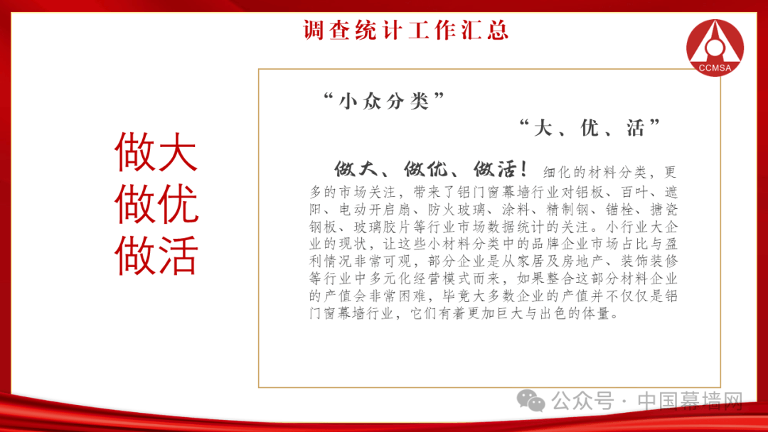 细化的材料分类,更多的市场关注,带来了铝门窗幕墙行业对铝板、百叶、遮阳、电动开启扇、防火玻璃、涂料、精制钢、锚栓、搪瓷钢板、玻璃胶片等行业市场数据统计的关注。小行业大企业的现状,让这些小材料分类中的品牌企业市场占比与盈利情况非常可观,部分企业是从家居及房地产、装饰装修等行业中多元化经营模式而来,如果整合这部分材料企业的产值会非常困难,毕竟大多数企业的产值并不仅仅是铝门窗幕墙行业,它们有着更加巨大与出色的体量。