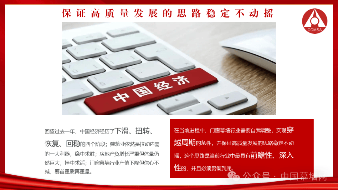 今年以来,我国经济总体回升向好,高质量发展扎实推进,门窗幕墙行业的发展也来到了历史的全新节点。今天的行业要看到成绩、坚定信心,也要正视问题、直面挑战。